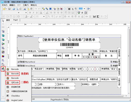 ????單據確認開單后,可打印出單據編號的條形碼發(fā)給倉庫人員,條形碼可在打印模板中進行設置,開單界面打印按鈕下點擊打印格式設計,在打印格式設計界面點擊“設計格式”,進入模板設計器界面,點擊左側工具欄的最后一個圖標,選擇第二個“Barcode”后在模板上添加文本框,然后雙擊打開文本框,彈出的條碼編輯器中代碼取“單據主體-單據編號”、條碼類型取“Code128”(二維碼選擇“QRCode”;二維碼直接雙擊選擇數(shù)據項單據主體-單據編號),設置好后點擊確定,然后預覽模板可顯示單據編號的條形碼信息。如下圖所示: