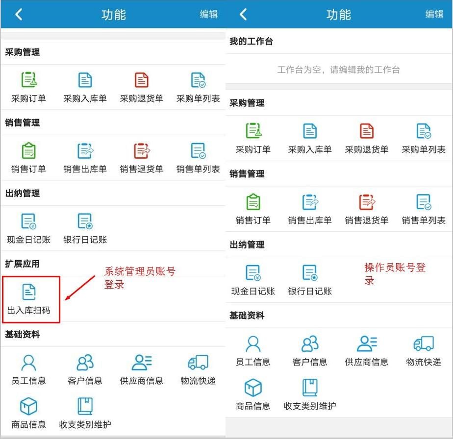 ????操作員賬號登錄手機APP同樣無法查看“出入庫掃碼”功能,如下圖所示: