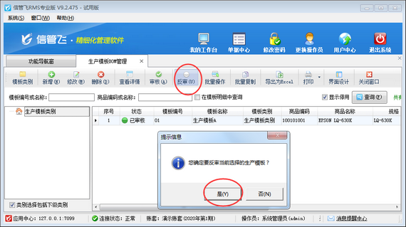 ????在生產(chǎn)模板BOM管理界面,選擇一個(gè)已審核的生產(chǎn)模板,在工具欄中點(diǎn)擊“反審”按鈕,系統(tǒng)彈出提示信息“您確定要反審當(dāng)前選擇的生產(chǎn)模板?”,然后點(diǎn)擊“是”按鈕對(duì)已審核的生產(chǎn)模板進(jìn)行反審操作,如下圖所示。