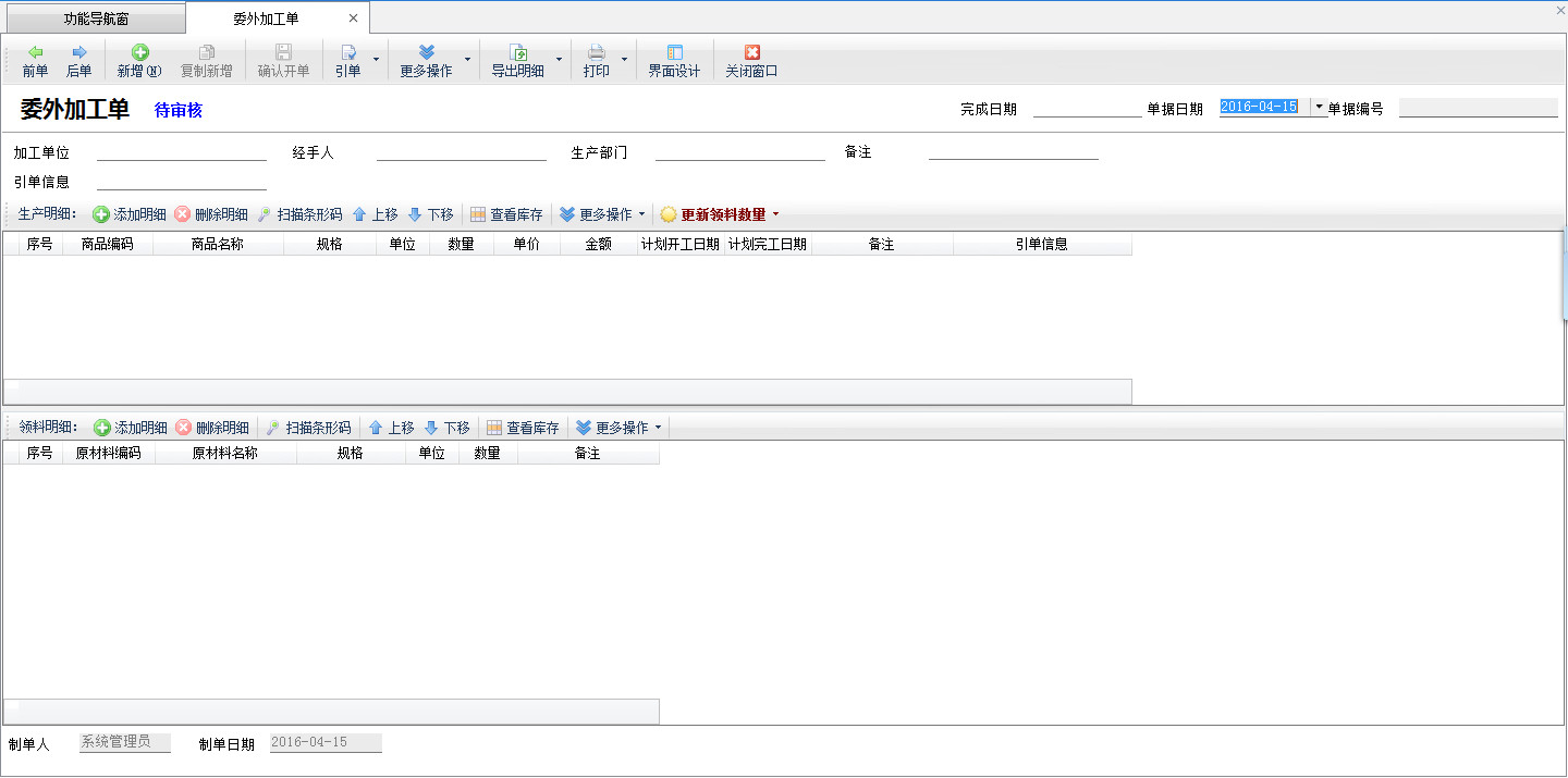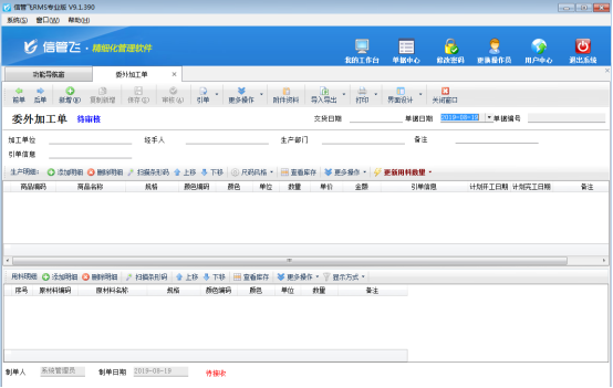 ????(2)當(dāng)需要加工廠進(jìn)行加工時(shí),開“委外加工單”錄入加工任務(wù),軟件會(huì)根據(jù)生產(chǎn)模板自動(dòng)算出需要的原材料明細(xì)。
