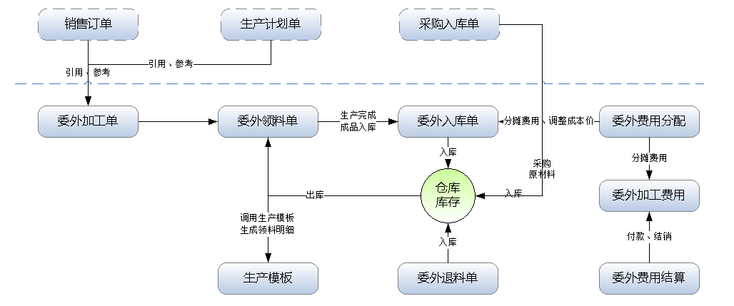 ????實(shí)際的企業(yè)生產(chǎn)業(yè)務(wù)中經(jīng)常會(huì)涉及委外代加工業(yè)務(wù),有時(shí)候需要委托外部工廠幫我們生產(chǎn)一些配件,有時(shí)候需要幫忙生成半成品,然后委外生產(chǎn)的成品或半成品,再進(jìn)入我們車間進(jìn)行再加工(如包裝封箱、或二次加工等)。專業(yè)版及以上版本可以購買 “委外加工管理”擴(kuò)展功能模塊來管理此業(yè)務(wù)。