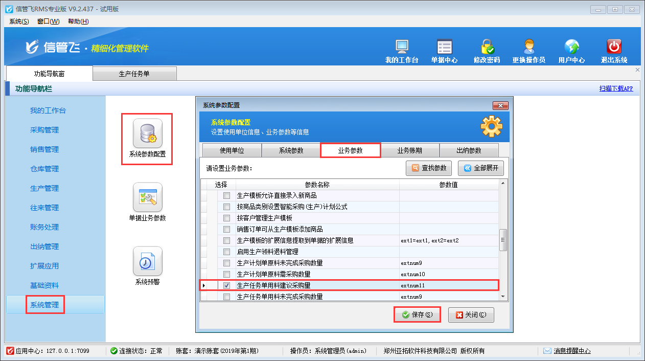 ????在功能導(dǎo)航窗點(diǎn)擊“系統(tǒng)管理”—》“系統(tǒng)參數(shù)配置”—》“業(yè)務(wù)參數(shù)”打開業(yè)務(wù)參數(shù)配置界面,然后在生產(chǎn)管理相關(guān)參數(shù)中打鉤啟用“生產(chǎn)任務(wù)單用料建議采購量”參數(shù),并設(shè)置參數(shù)值,默認(rèn)為“extnum11(擴(kuò)展數(shù)值11)”,如下圖所示。