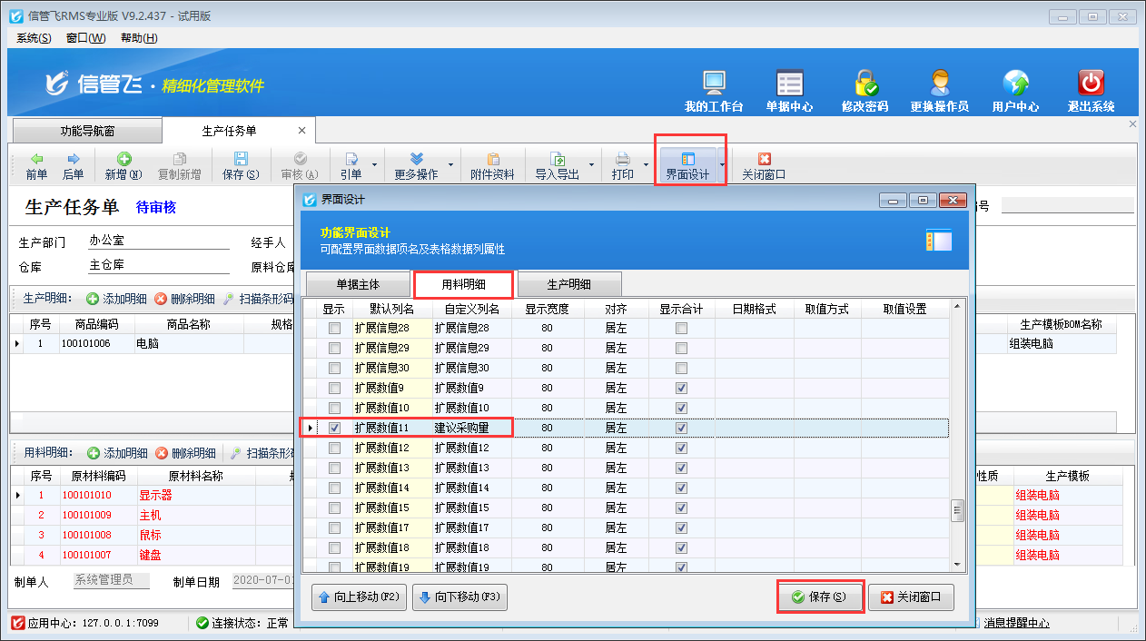 ????參數(shù)配置完成之后,打開生產(chǎn)任務(wù)單,在“界面設(shè)計(jì)”—》“用料明細(xì)”中將“擴(kuò)展數(shù)值11”自定義列名為“建議采購量”,并勾選顯示出來,如下圖所示。