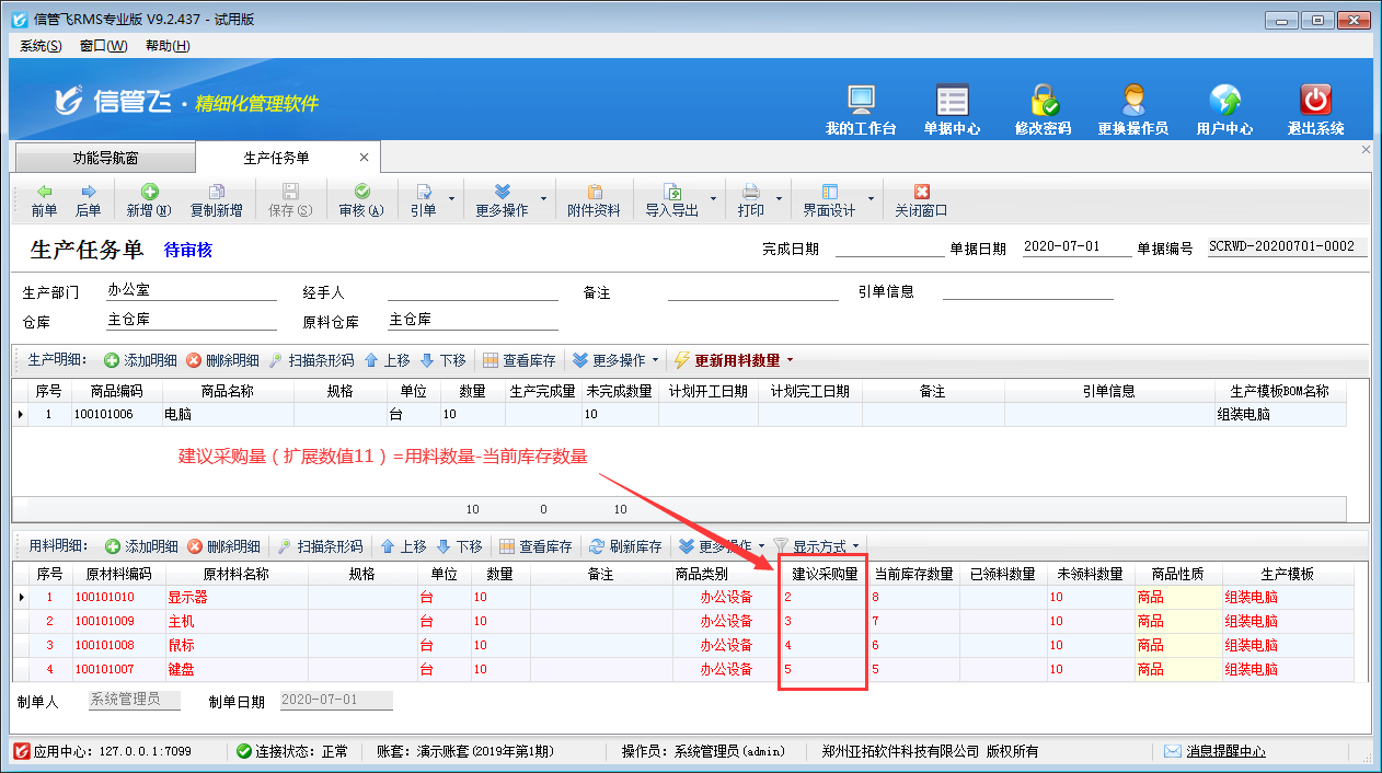 ????另外軟件也支持配置根據(jù)原材料用料數(shù)量及原材料當(dāng)前庫存數(shù)量自動(dòng)計(jì)算出原材料需采購的數(shù)量,進(jìn)而生成采購訂單進(jìn)行采購,本文示范一下如何配置自動(dòng)計(jì)算生產(chǎn)任務(wù)單用料建議采購量?