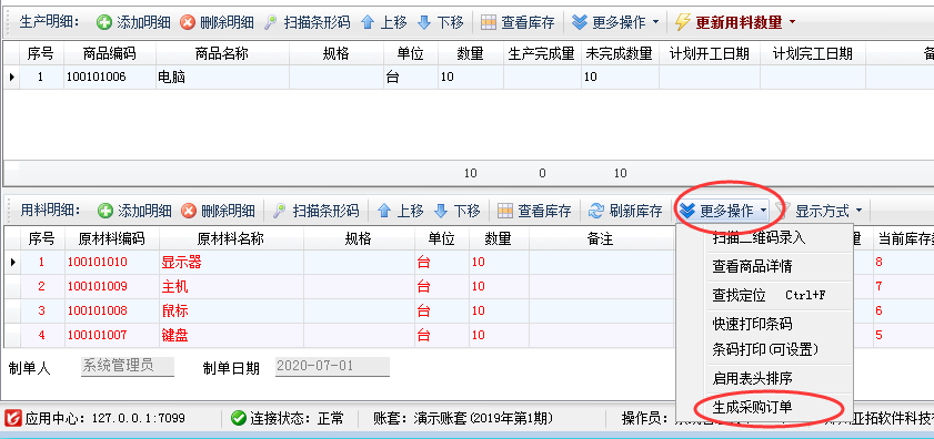 ????點(diǎn)擊“用料明細(xì)”工具欄“更多操作”—》“生成采購訂單”即可將原材料建議采購量直接生成采購訂單便于采購人員進(jìn)行采購,如下圖所示。