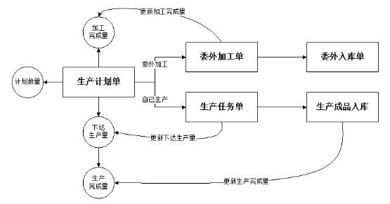 ????②生產(chǎn)計(jì)劃明細(xì)中只能輸入計(jì)劃數(shù)量(即計(jì)劃生產(chǎn)數(shù)量),其他數(shù)量由后續(xù)單據(jù)執(zhí)行后自動(dòng)更新。下圖為不同業(yè)務(wù)單據(jù)更新相應(yīng)數(shù)量示意圖: