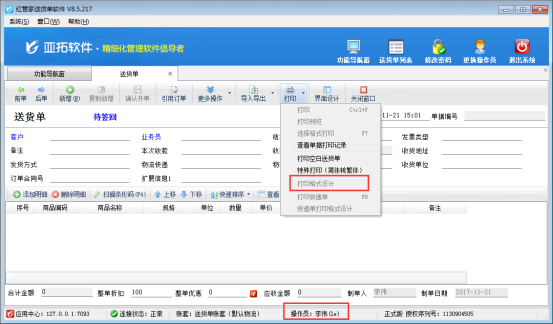 亞拓軟件自主研發的亞拓管理軟件、紅管家送貨單軟件、紅管家票據打印軟件、紅管家倉庫管理軟件都支持自定義設計打印模板,打印模板設計完成后,為了避免操作員修改錯打印模板,軟件可以設置操作員的打印模板設計權限。(系統管理員默認具有所有權限,不允許修改)。 以送貨單軟件為例,示范下如何控制操作員的打印模板設計權限,在功能導航窗,選擇系統管理—》操作員及授權—》選擇操作員“李偉”,然后在“其他操作權限”中把打印格式設計權限前的勾選符號取消,然后點擊“保存權限設置”,如下圖1所示:圖1 &