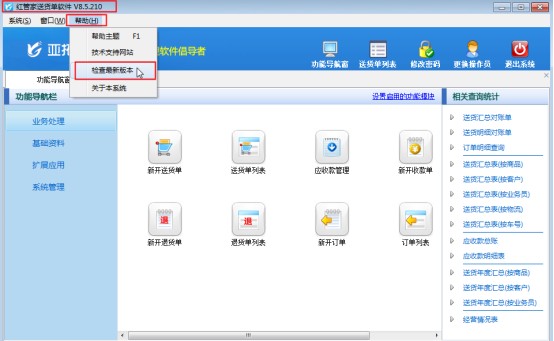 亞拓軟件自主研發的亞拓管理軟件、紅管家倉庫管理軟件、紅管家送貨單軟件、紅管家出納記賬軟件、紅管家票據打印軟件等軟件都是不斷升級更新版本的。亞拓軟件官網會不定期發布最新版,新版本會根據客戶反饋問題和測試問題改進軟件功能并處理程序存在的Bug,從而不斷優化和調整軟件功能、性能。軟件購買后后續版本免費升級,軟件支持聯網檢查最新版本,用戶檢查到最新版后下載安裝最新版本即可。 本文我們以紅管家送貨單軟件為例,截止到本文發布日期,紅管家送貨單軟件最新版是V8.5.217版本,我們以V8.5.210版本為例介紹下軟件聯網檢查最新版的兩