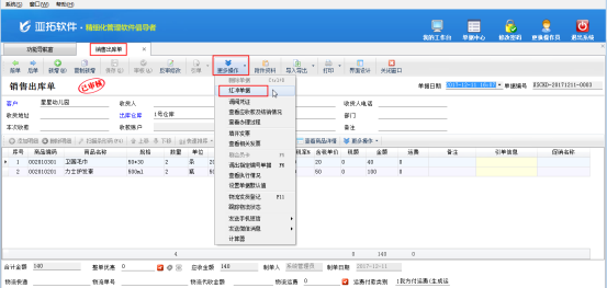 亞拓軟件開發的新架構進銷存軟件——亞拓管理軟件具有紅沖單據的功能,紅沖相當于作廢,有時單據已審核后又發現有錯誤或者不需要此單據了,想刪除此單據時,此時可以將“已審核”的單據進行紅沖,紅沖后的單據會變為無效,相應的應付款、應收款會刪除,之前對庫存的影響也會解除。下面我們以亞拓管理軟件專業版的銷售出庫單為例,介紹一下紅沖單據(作廢單據)的操作方法。1、可以在銷售單列表紅沖作廢銷售出庫單 在功能導航窗點擊“銷售管理”—》“銷售單列表”即可打開“銷售單列表”界面,選中需要作廢的單據,然后點擊“更多操作”—》“紅沖單據(作廢單據)