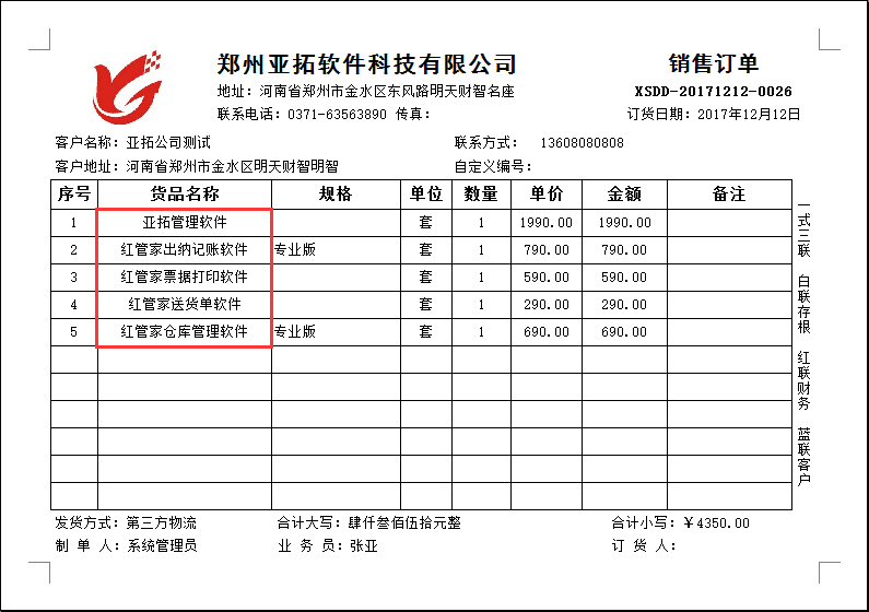 亞拓軟件自主研發的亞拓管理軟件(星光版、標準版、專業版)、紅管家送貨單軟件和紅管家倉庫管理軟件等內置有多種打印格式模版,同時也支持自定義打印格式模版,用戶可以自定義打印樣式,軟件中內置的部分打印格式模版中有些文本框內容默認設置的為居左顯示(如圖一),部分用戶想要設置文本框內容居中顯示,如何設置?圖一 銷售訂單預覽效果圖 以亞拓管理軟件專業版為例,打開一個已開的銷售訂單單據,選擇“打印”按鈕下的“打印格式設計”,進入打印格式設計界面,選擇需要調整的打印格式模版,然后點擊“設計格式”按鈕進入模板設計器界面,如下圖