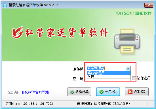 亞拓軟件旗下的亞拓管理軟件、紅管家送貨單軟件、紅管家出納記賬軟件等支持在軟件中設置多個操作員進行登錄軟件。許多用戶存在業務員離職后,其操作員權限仍存在,可以繼續使用其姓名進行開單操作。為了避免選擇離職員工登錄軟件開單,軟件支持可以刪除已離職或者不允許再登錄軟件的操作員的登錄權限。 以紅管家送貨單為例,我們示范下如何減少可登錄軟件的操作員。軟件登錄界面的可登錄人員如下圖1所示:圖1 例如員工“張楠”離職,可以在員工信息窗口設置員工“張楠”的狀態為離職。