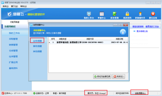 此文章相關(guān)演示視頻:如何啟用消息提醒功能演示視頻 信管飛軟件中客戶下訂單后,新增訂單支持設(shè)置消息提醒功能,啟用消息提醒功能后設(shè)置消息接收人員,該人員在登錄軟件時(shí),點(diǎn)擊消息提醒中心即可查看新增訂單單據(jù)并查看單據(jù)詳情,下面以信管飛RMS專業(yè)版為例介紹一下消息提醒功能。 在功能導(dǎo)航窗點(diǎn)擊“系統(tǒng)管理”—》“系統(tǒng)參數(shù)配置”—》“業(yè)務(wù)參數(shù)”,業(yè)務(wù)單據(jù)相關(guān)參數(shù)下,打勾“啟用消息提醒功能”,保存設(shè)置,如下圖所示: 在功