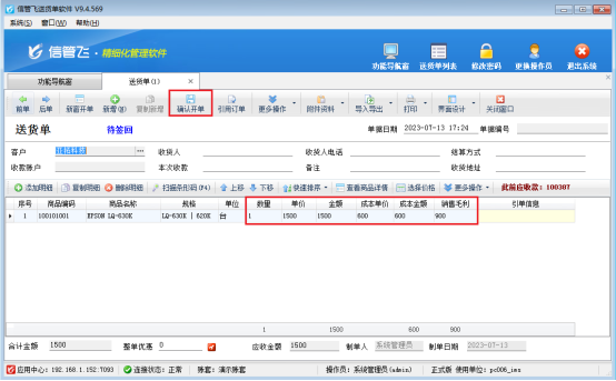 此文章相關(guān)演示視頻:送貨單開單界面如何設(shè)置自動(dòng)計(jì)算銷售毛利演示視頻 信管飛送貨單軟件可以維護(hù)每個(gè)商品的成本價(jià),在送貨單銷售情況進(jìn)行自動(dòng)計(jì)算,可以清晰查看商品的銷售毛利。下面我們介紹一下送貨單軟件如何設(shè)置自動(dòng)計(jì)算銷售毛利? 一、開送貨單之前先維護(hù)商品成本價(jià) 在功能導(dǎo)航窗點(diǎn)擊“基礎(chǔ)資料”—》“商品信息”打開商品信息界面,以商品“EPSON LQ-630K”為例,選擇商品后點(diǎn)擊“修改”按鈕,錄入成本價(jià)為600
