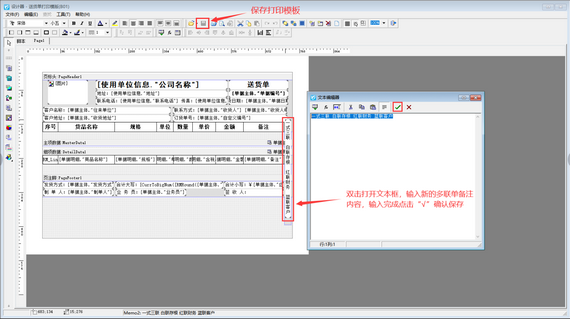 演示視頻觀看鏈接:打印模板如何修改右側(cè)多聯(lián)單用途備注演示視頻 送貨單一般情況下是一式三聯(lián)(存根聯(lián)、財(cái)務(wù)聯(lián)、客戶聯(lián)),如下圖所示。有用戶需要打印一式二聯(lián)、一式四聯(lián)或者一式五聯(lián),需要修改送貨單右側(cè)多聯(lián)單用途備注。軟件支持自定義修改,本文介紹一下操作方法。 打開一個(gè)銷售出庫(kù)單,在單據(jù)界面工具欄點(diǎn)擊“打印”—》“打印格式設(shè)計(jì)”,在打開的打印格式設(shè)計(jì)窗口選擇需要調(diào)整的打印格式模板,然后點(diǎn)擊“設(shè)計(jì)格式”進(jìn)入模板設(shè)計(jì)器,如下圖所示。 在模板設(shè)計(jì)器內(nèi),選擇模板右側(cè)“