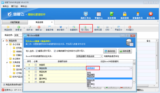 信管飛軟件支持通過Excel導(dǎo)入數(shù)據(jù),通過Excel數(shù)據(jù)導(dǎo)入可以將數(shù)據(jù)方便快捷的導(dǎo)入到軟件中,省去了使用初期大量的數(shù)據(jù)的錄入所要消耗的時(shí)間及人力物力,并避免人為錄入的誤差,使數(shù)據(jù)錄入的簡(jiǎn)單、準(zhǔn)確、高效。下面我們以信管飛RMS軟件為例,示范下導(dǎo)入商品信息后,商品類別沒導(dǎo)入成功,如何解決? 方式一:刪除已導(dǎo)入商品,重新導(dǎo)入,數(shù)據(jù)項(xiàng)商品類別需要對(duì)應(yīng)EXCEL中商品類別數(shù)據(jù)列,如圖所示: 方式二:已導(dǎo)入大量商品信息不想刪除,可以進(jìn)行批量修改商品類別。&nbs