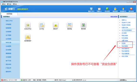 演示視頻觀看鏈接:信管飛RMS如何設(shè)置操作員不可查看資產(chǎn)負(fù)債表演示視頻 財(cái)務(wù)報(bào)表是財(cái)務(wù)報(bào)告的主要部分,是反映企業(yè)或預(yù)算單位一定時(shí)期資金、利潤(rùn)狀況的會(huì)計(jì)報(bào)表。信管飛RMS專業(yè)版支持財(cái)務(wù)處理功能,可登記會(huì)計(jì)憑證,并支持生成財(cái)務(wù)報(bào)表,如資產(chǎn)負(fù)債表、利潤(rùn)表、現(xiàn)金流量表等,如下圖所示。如果不希望員工賬號(hào)登錄后查看到這些報(bào)表,如何設(shè)置呢?本篇文章演示一下如何設(shè)置操作員不可查看資金負(fù)債表? 登錄軟件,在功能導(dǎo)航窗點(diǎn)擊“系統(tǒng)管理”—》“操作員及授權(quán)”,進(jìn)入“操作員管理及授權(quán)”界面,選擇操作員“張亞”,在其右側(cè)的功