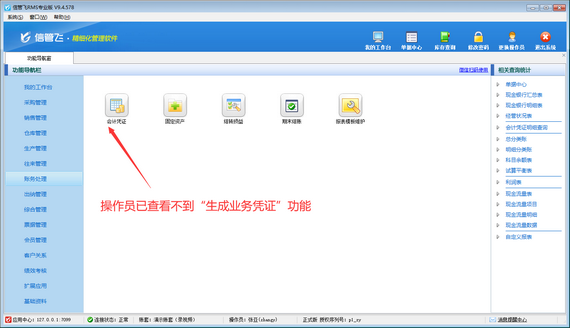 演示視頻觀看鏈接:信管飛RMS如何設(shè)置操作員不可生成業(yè)務(wù)憑證演示視頻 信管飛RMS專業(yè)版包含財(cái)務(wù)處理功能,可登記會(huì)計(jì)憑證,支持直接對(duì)已開單據(jù)進(jìn)行快速生成會(huì)計(jì)憑證操作,如下圖所示。為避免操作員誤生成會(huì)計(jì)憑證,軟件支持設(shè)置操作員權(quán)限,本篇文章介紹下如何設(shè)置操作員不可使用生成業(yè)務(wù)憑證功能? 登錄軟件,在功能導(dǎo)航窗點(diǎn)擊“系統(tǒng)管理”—》“操作員及授權(quán)”,進(jìn)入“操作員管理及授權(quán)”界面,選擇操作員“張亞”,在其右側(cè)的功能模塊權(quán)限內(nèi)選擇“財(cái)務(wù)處理”,將生成業(yè)務(wù)憑證的“使用”權(quán)限勾選取消,然