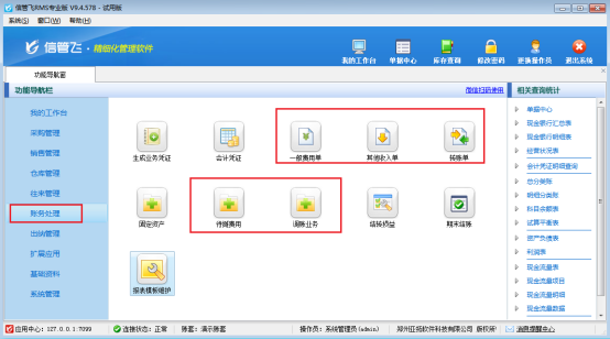 此文章相關(guān)演示視頻:專業(yè)版軟件如何顯示財(cái)務(wù)處理輔助單據(jù)演示視頻 信管飛RMS專業(yè)版軟件支持使用財(cái)務(wù)處理功能,部分用戶在使用最新版本軟件時(shí),會(huì)發(fā)現(xiàn)財(cái)務(wù)處理功能沒有一般費(fèi)用單、其他收入單、調(diào)賬業(yè)務(wù)等功能,這是因?yàn)槲垂催x“顯示財(cái)務(wù)處理輔助單據(jù)”參數(shù)導(dǎo)致的,本文以“RMS專業(yè)版”為例介紹下如何顯示財(cái)務(wù)處理輔助單據(jù)? 功能導(dǎo)航欄點(diǎn)擊“財(cái)務(wù)處理”,此時(shí)財(cái)務(wù)處理輔助單據(jù)未顯示。如圖所示: 功能導(dǎo)航欄點(diǎn)擊“系統(tǒng)管理”-