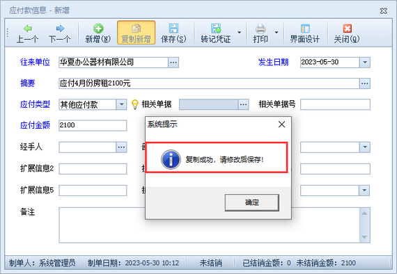 演示視頻觀看鏈接:出納記賬軟件如何復(fù)制新增應(yīng)付款演示視頻 信管飛出納記賬軟件應(yīng)付款管理功能可以對采購應(yīng)付款、采購預(yù)付款、采購?fù)素洃?yīng)退款、期初應(yīng)付款、其他應(yīng)付款(如房租)等各類應(yīng)付款項進(jìn)行集中管理。其中房租一般是固定的,每個月都一樣,系統(tǒng)支持復(fù)制上個月的應(yīng)付款房租數(shù)據(jù)生成新的應(yīng)付款,本篇文章介紹一下操作方法。 在功能導(dǎo)航窗點擊“往來管理”—》“應(yīng)付款管理”打開應(yīng)付款管理界面,如下圖所示。 選擇需要被復(fù)制的房租應(yīng)付款信息,工具欄點擊“修改”按鈕,在打開的