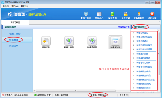 此文章相關演示視頻:操作員無法查看銷售管理相關查詢,如何解決演示視頻 信管飛軟件操作員及授權實現對操作員的管理和權限分配。權限分為功能模塊權限、其他操作權限、數據權限等。另外部分權限(如資金賬戶權限)需要在“系統參數配置”中啟用相應的參數,才可以使用。 以操作員“李拓”為例,未設置操作員銷售管理相關查詢權限時,操作員賬號登錄,銷售管理右側相關查詢為空白,本文以信管飛RMS軟件為例演示一下操作員賬號無法查看銷售管理相關查詢,如何解決?如圖所示:&nbs