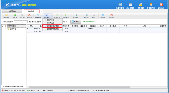 此文章相關演示視頻:送貨單軟件如何批量設置客戶所屬部門演示視頻 信管飛RMS、信管飛倉庫管理軟件、信管飛送貨單軟件等都支持批量維護客戶信息,可批量維護客戶信息的名稱、聯系人、電話、地址等信息。同時也支持批量維護客戶所屬部門,本篇文章以送貨單軟件為例介紹一下如何批量設置客戶所屬部門? 在功能導航窗點擊“基礎資料”—》“客戶信息”,“更多操作”下點擊“批量維護客戶信息”進入批量維護客戶信息界面,如下圖所示