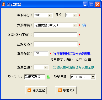銷(xiāo)項(xiàng)發(fā)票目前主要分為定額發(fā)票、增值稅發(fā)票、一般機(jī)打發(fā)票三種,公司會(huì)計(jì)人員在稅局購(gòu)領(lǐng)后,需要在第一時(shí)間內(nèi),在《紅管家財(cái)務(wù)出納記賬系統(tǒng)》中進(jìn)行登記。主要登記信息包括: