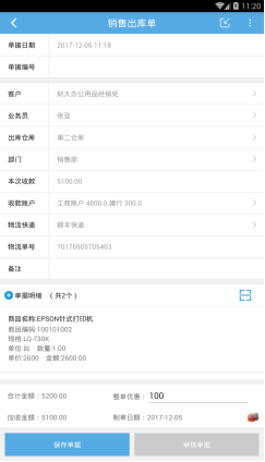 PC端配置完移動APP的界面后打開銷售出庫單界面,界面顯示如下圖6所示(點擊單據明細的商品信息可以顯示出商品的詳情信息):