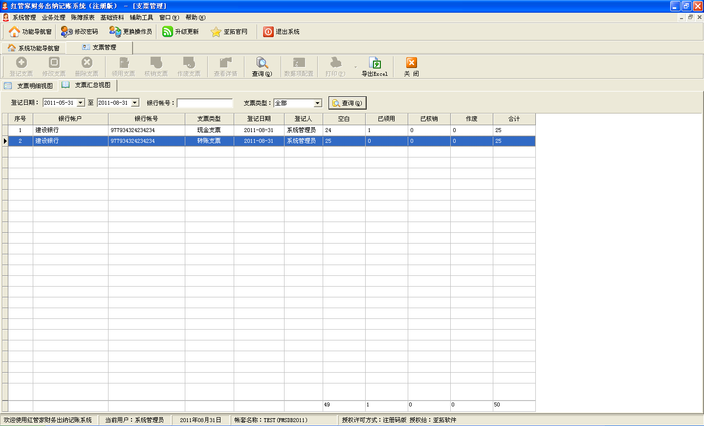 3、支票管理增加匯總視圖,方便查看發票領用、核銷、作廢情況。