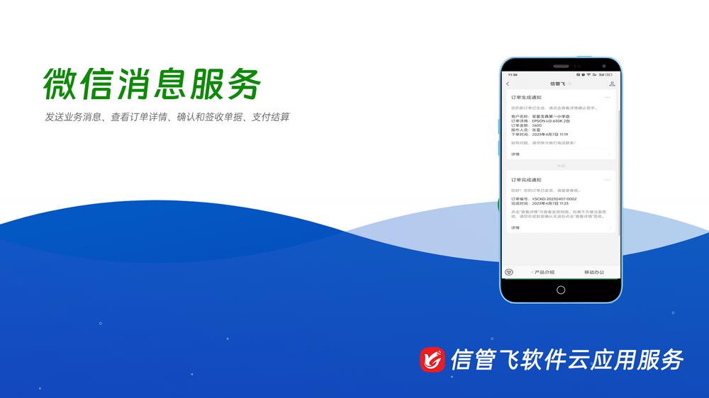 微信消息服務是信管飛軟件基于微信開放平臺研發的業務消息發送服務,支持即時推送業務單據消息(如訂單通知、發貨信息、催款通知等),支持客戶查看消息詳情(可配置外部查看數據項)、單據簽收確認、分享轉發等功能。
