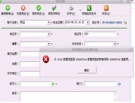 首次下載安裝好好用財務(wù)出納記賬系統(tǒng),在“現(xiàn)金日記賬”或“銀行日記賬”功能中,點擊“新增憑證”進行憑證錄入時,如果出現(xiàn)下圖所示錯誤: