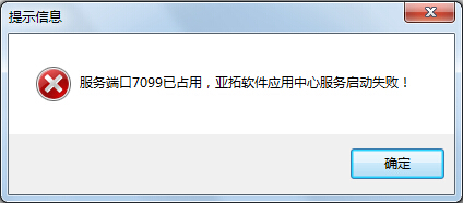 亞拓管理軟件默認(rèn)使用 7099 通訊端口,如果用戶使用多款亞拓軟件開發(fā)的管理軟件,就需要修改一下通訊端口,否則啟動(dòng)“亞拓軟件應(yīng)用中心”程序時(shí),軟件會(huì)提示如下錯(cuò)誤信息: