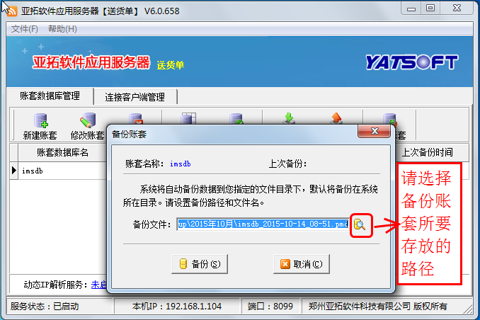 先在原主機上登錄軟件檢查下數據,確認沒問題后,打開亞拓軟件應用服務器,在亞拓軟件應用服務器上選中賬套,點擊“備份賬套”執行備份賬套操作,點擊備份賬套后,會彈出“備份賬套”窗口,可以選擇備份文件所存放的路徑(一般情況下默認存放在軟件的安裝目錄下DBBackup文件夾下),然后將剛才備份的賬套數據文件通過U盤或者移動硬盤等方式拷貝到新主機電腦上。
