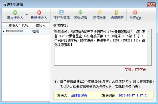 亞拓管理軟件以及紅管家送貨單軟件中集成了手機短信發送服務,可以發送開單通知、發貨通知、生日祝福、應收款催款短信等業務短信。軟件中可以設置短信模板,系統會自動調取單據中的內容,無需我們手動輸入繁瑣的內容,可以節約我們寶貴的時間和精力。軟件也支持自定義發送短信。統一采用1065全國全網正規通道,速度更快,更能提升企業形象,軟件只能發送發貨通知等業務短信,嚴禁群發營銷短信。