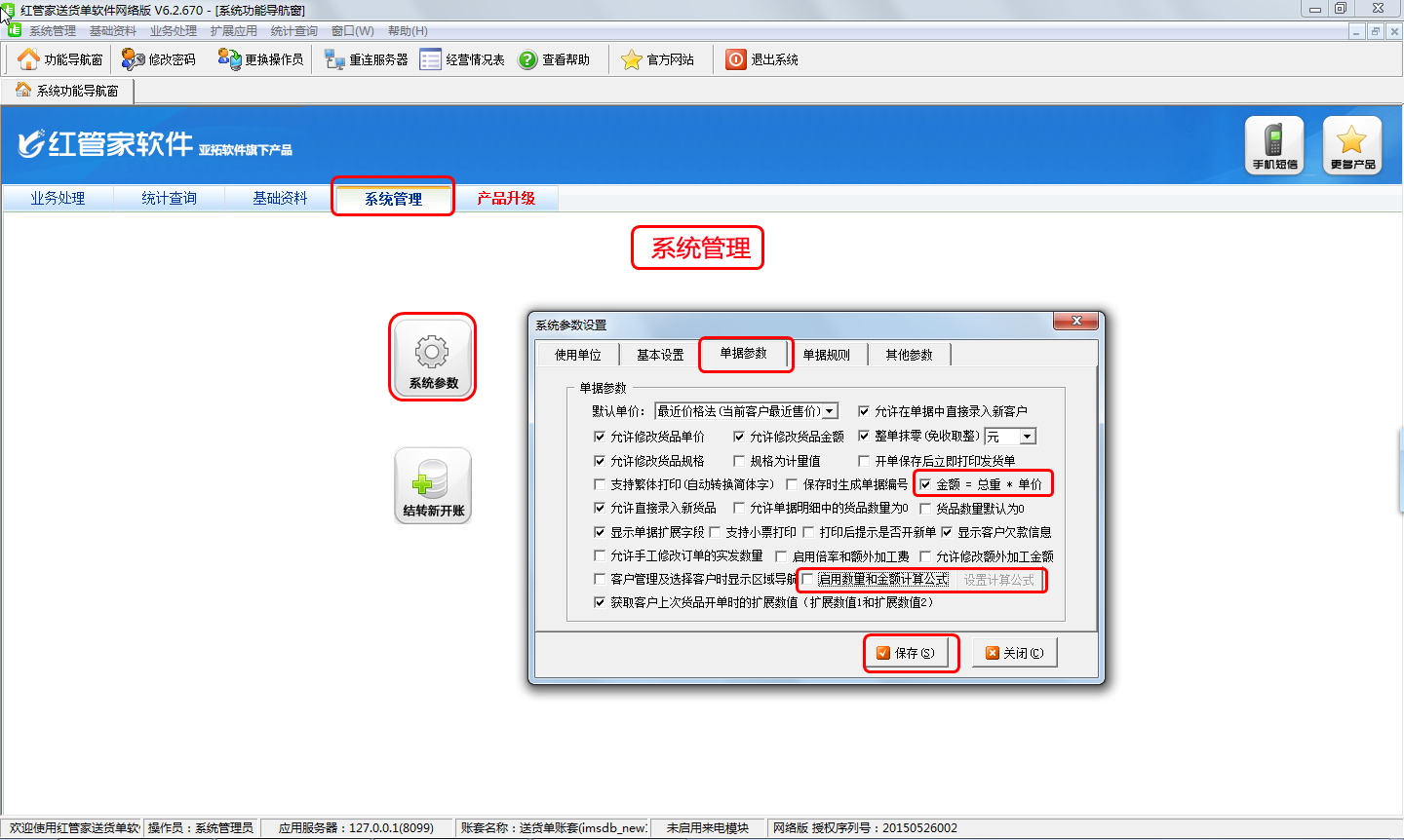 首先打開功能導(dǎo)航窗,點(diǎn)擊“系統(tǒng)管理”—》“系統(tǒng)參數(shù)”—》“單據(jù)參數(shù)”,將默認(rèn)復(fù)選的“啟用數(shù)量和金額計(jì)算公式”選項(xiàng)打勾取消,然后打勾選中“金額=總重*單價(jià)”選項(xiàng)啟用按重量計(jì)算金額,配置完之后點(diǎn)擊“保存”按鈕保存剛剛所做的配置,如下圖一所示。