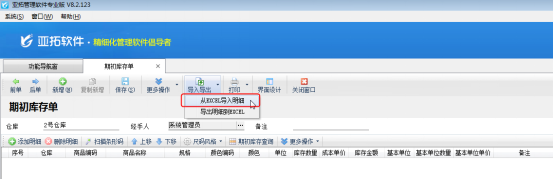 ①請在使用軟件前先盤點倉庫,確定庫存數量和成本單價,建議先整理成Excel文件,可以直接導入進來。點擊“期初庫存單”的“導入導出”按鈕,如下圖所示,點“從Excel導入明細”選擇準備好的Excel文件。