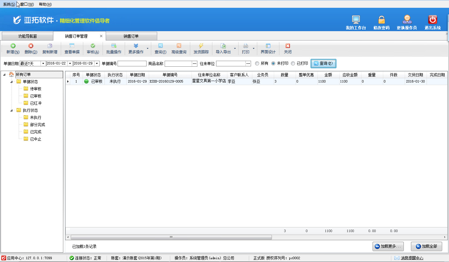 訂單執行:訂單執行狀態分為未執行、部分完成、已完成、已中止共4種狀態。