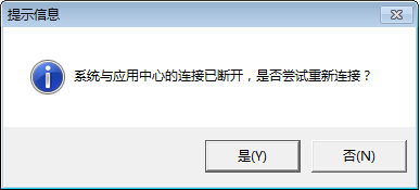 第一種解決方式:鼠標雙擊軟件界面最下方的“連接狀態:已斷開”字樣,系統會彈出“系統與應用中心的連接已斷開,是否嘗試重新連接?”提示信息,如圖2所示,點“是”按鈕,客戶端程序會嘗試重新建立與應用中心程序的連接。如果連接成功即可打開相應的功能,繼續使用軟件。