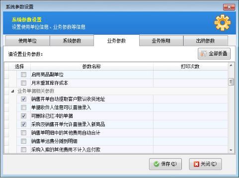 軟件中默認是不允許開單時直接錄入新商品的,所以需要我們在使用此功能之前對相應(yīng)的業(yè)務(wù)參數(shù)進行設(shè)置。在業(yè)務(wù)參數(shù)界面上我們將“采購及銷售開單允許直接錄入新商品”勾選上,然后進行保存。