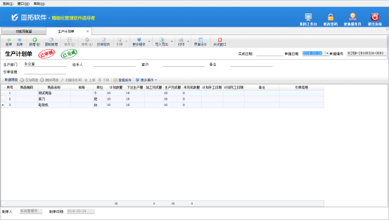 (3)已完成:當生產(chǎn)計劃單中所有商品的生產(chǎn)完成數(shù)量都等于或大于計劃數(shù)量,則計劃單的狀態(tài)變?yōu)椤耙淹瓿伞薄?/P>