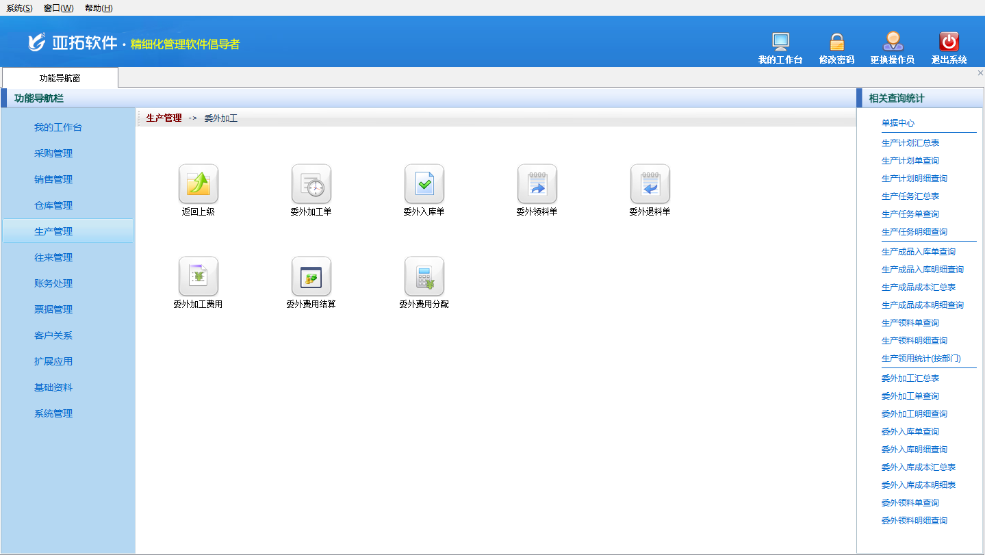 在功能導(dǎo)航窗,點(diǎn)擊“生產(chǎn)管理”—》“委外加工”,即可進(jìn)入委外加工管理界面,如下圖所示。