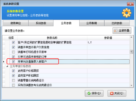 軟件中默認是允許開單時直接錄入新客戶/供應商的。如果該業務參數沒有被勾選,需要我們在使用此功能之前對相應的業務參數進行設置。在業務參數界面上我們將“開單允許直接錄入新客戶”勾選上,然后進行保存。