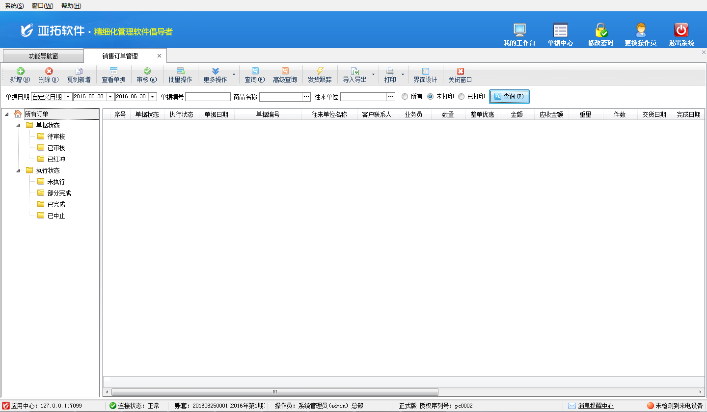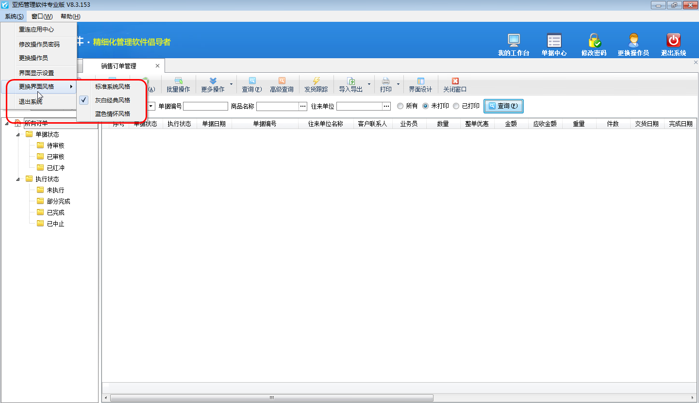 亞拓管理軟件內(nèi)提供了3種不同的界面風(fēng)格(標(biāo)準(zhǔn)系統(tǒng)風(fēng)格、灰白經(jīng)典風(fēng)格、藍(lán)色情懷風(fēng)格),軟件安裝后默認(rèn)為“灰白經(jīng)典風(fēng)格”,如下圖所示。