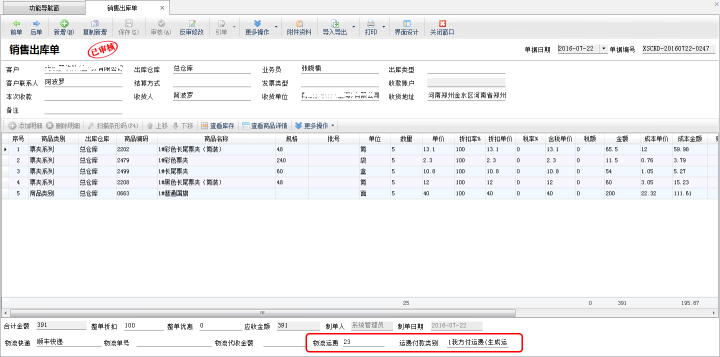 (3)代客戶付運費(不生成運費應付款,運費計入應收金額):運費付款類別選擇“代客戶付運費(不生成運費應付款,運費計入應收金額)”時,輸入物流運費后,保存并審核單據的時候,運費可以合計到“應收金額”內,但是不會生成“物流運費應付款”。