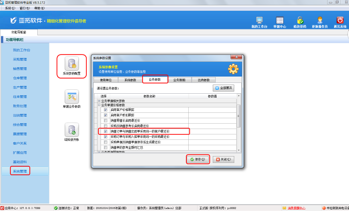 在功能導(dǎo)航窗點(diǎn)擊“系統(tǒng)管理”——》“系統(tǒng)參數(shù)配置”——》“業(yè)務(wù)參數(shù)”可以進(jìn)入到“業(yè)務(wù)參數(shù)”配置界面,在業(yè)務(wù)單據(jù)價(jià)格參數(shù)內(nèi)打勾啟用“銷售訂單與銷售出庫單采用統(tǒng)一的客戶最近價(jià)”參數(shù),如下圖一所示。