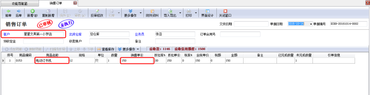 設(shè)置完成之后,在功能導(dǎo)航窗點(diǎn)擊“銷售管理”——》“銷售訂單”,新增銷售訂單,客戶“星星文具第一小學(xué)店”需要訂購商品“電動(dòng)訂書機(jī)”,銷售單價(jià)為150元。如下圖二所示。