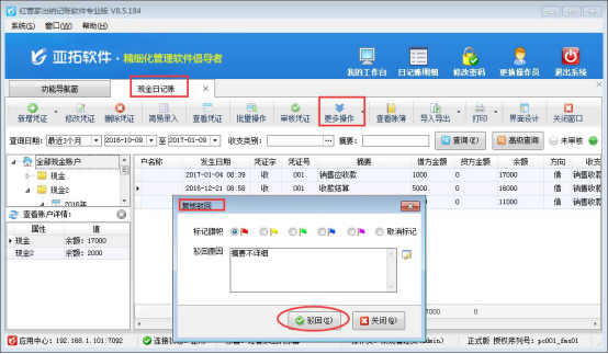 以出納記賬軟件專業(yè)版的現(xiàn)金日記賬為例,如何標(biāo)記駁回原因。打開左側(cè)導(dǎo)航窗的“出納管理”,選擇“現(xiàn)金日記賬”中一個(gè)憑證(只有待審核的憑證才能被標(biāo)記),點(diǎn)擊工具欄中的“更多操作”下的符合駁回,可對(duì)有問題的憑證標(biāo)記顏色和駁回原因,如下圖所示: