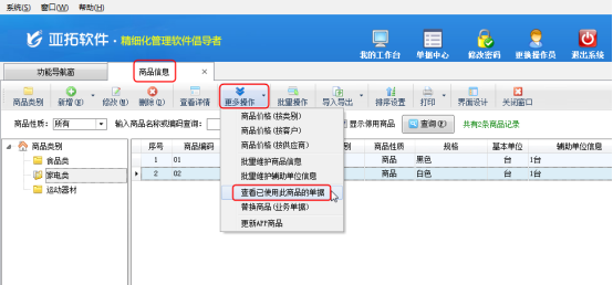 亞拓管理軟件、紅管家送貨單軟件、紅管家倉庫管理軟件都包括對商品信息的管理,軟件都支持對商品進行查看已使用此商品的單據,方便用戶查看使用過該商品的全部的單據信息。本文以亞拓管理軟件為例詳細介紹一下軟件中“查看已使用此商品的單據”功能的使用方法。