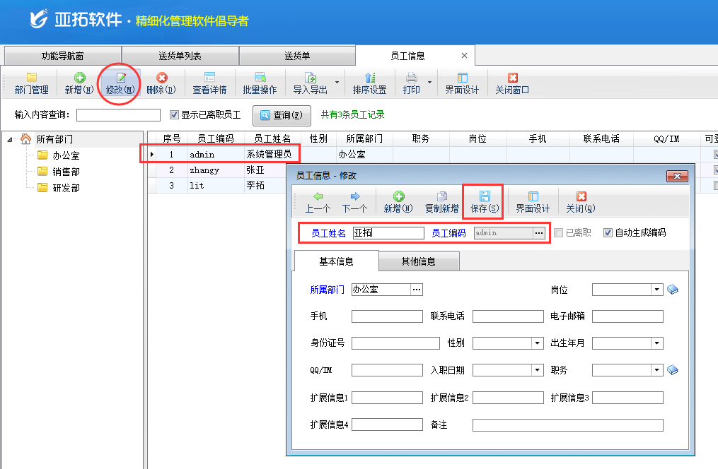 在功能導航窗點擊“基礎資料”——》“員工信息”,打開員工信息主界面,選擇“系統管理員”修改資料并保存,如圖二所示中將“系統管理員”修改為“亞拓”,修改之后重新登陸軟件開單時,即可看到“制單人”已更改為“亞拓”,如圖三所示。