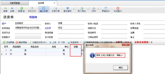 以送貨單軟件為例,在默認條件下不填寫數(shù)量保存會提示信息,如下圖1所示:
