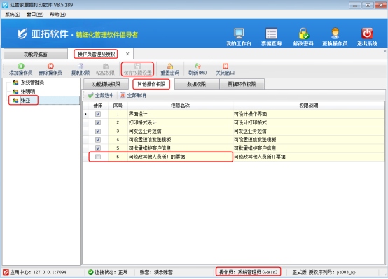 紅管家票據(jù)打印軟件支持多個(gè)操作員,并且可以對(duì)操作員設(shè)置不同的權(quán)限。軟件默認(rèn)操作員可以修改其他人員所開(kāi)的票據(jù),軟件也可以設(shè)置操作員不可修改其他人員錄入的票據(jù),下面我們講一下如何設(shè)置操作員不可修改其他人員所開(kāi)的票據(jù)。